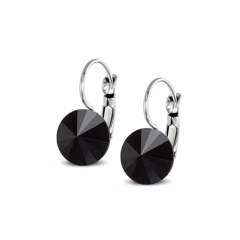 Ocelové visací náušnice jsou vyrobeny z kvalitní chirurgické oceli v lesklé povrchové úpravě a jsou osázeny krystaly v černém odstínu Jet a v brusu Rivoli, o velikosti cca 10mm, pocházející z dílny rakouské společnosti Swarovski®. Díky pokovené zadní straně krystaly odráží daleko více světla a tak září na všechny strany.