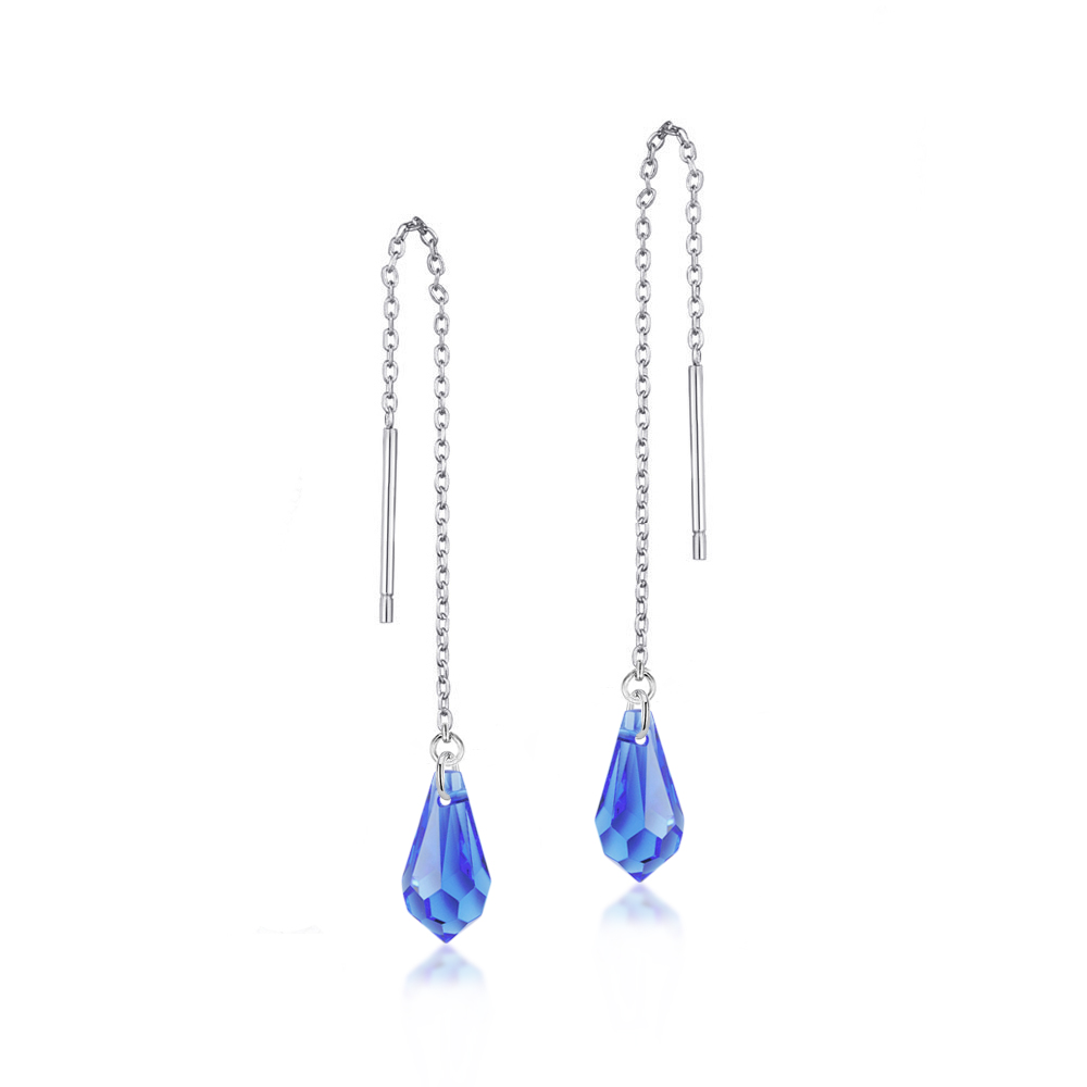 Tyto ocelové náušnice řetízkové Teardrop ve tvaru kapky jsou vyrobeny z kvalitní chirurgické oceli v lesklé povrchové úpravě a osázeny modrými safírovými krystaly v brusu Teardrop o velikosti 11mm pocházející z dílny rakouské společnosti Swarovski®. Díky pokovené zadní straně krystaly odráží daleko více světla a tak září na všechny strany.