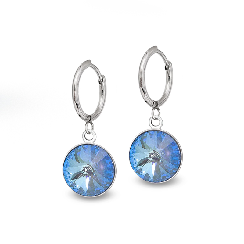 Ocelové visací náušnice - kroužkyz kolekce Delite jsou vyrobeny z kvalitní chirurgické oceli v lesklé povrchové úpravě a jsou osázeny světle modrými krystaly s barevnými odlesky, v brusu Rivoli Chaton o průměru 12mm, pocházející z dílny rakouské společnosti Swarovski®. Díky pokovené zadní straně krystaly odráží daleko více světla a tak září na všechny strany.