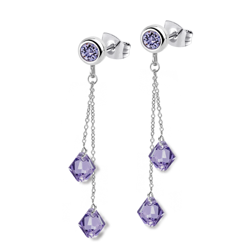 Ocelové barevné řetízkové náušnice Bicones - jsou vyrobeny z kvalitní chirurgické oceli v lesklé povrchové úpravě a zdobeny tanzanitově fialovými krystaly v brusu Xirus Chaton a 4 korálky v brusu sluníčka Xilion pocházející z dílny rakouské společnosti Swarovski®.