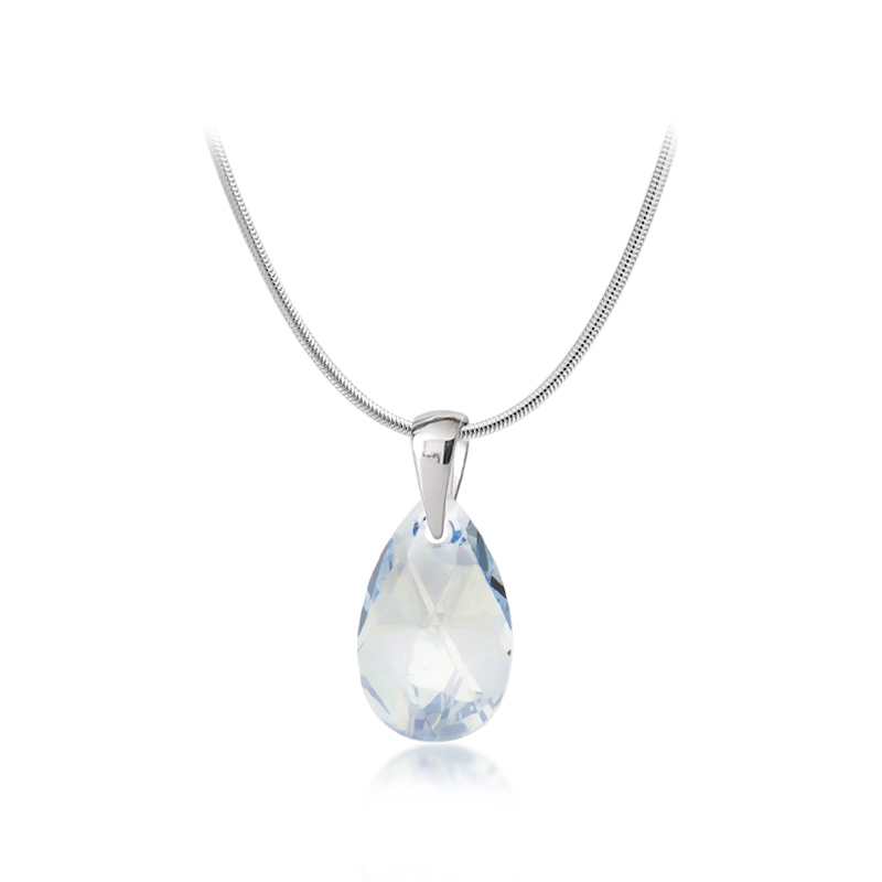 Ocelový náhrdelník ve tvaru kapky je vyroben z kvalitní chirurgické oceli v lesklé povrchové úpravě a je osázen světle modrým krystalem se zlatými odlesky v brusu Pear-Shaped o velikosti 16mm pocházející z dílny rakouské společnosti Swarovski®. Díky pokovené zadní straně krystaly odráží daleko více světla a tak září na všechny strany.