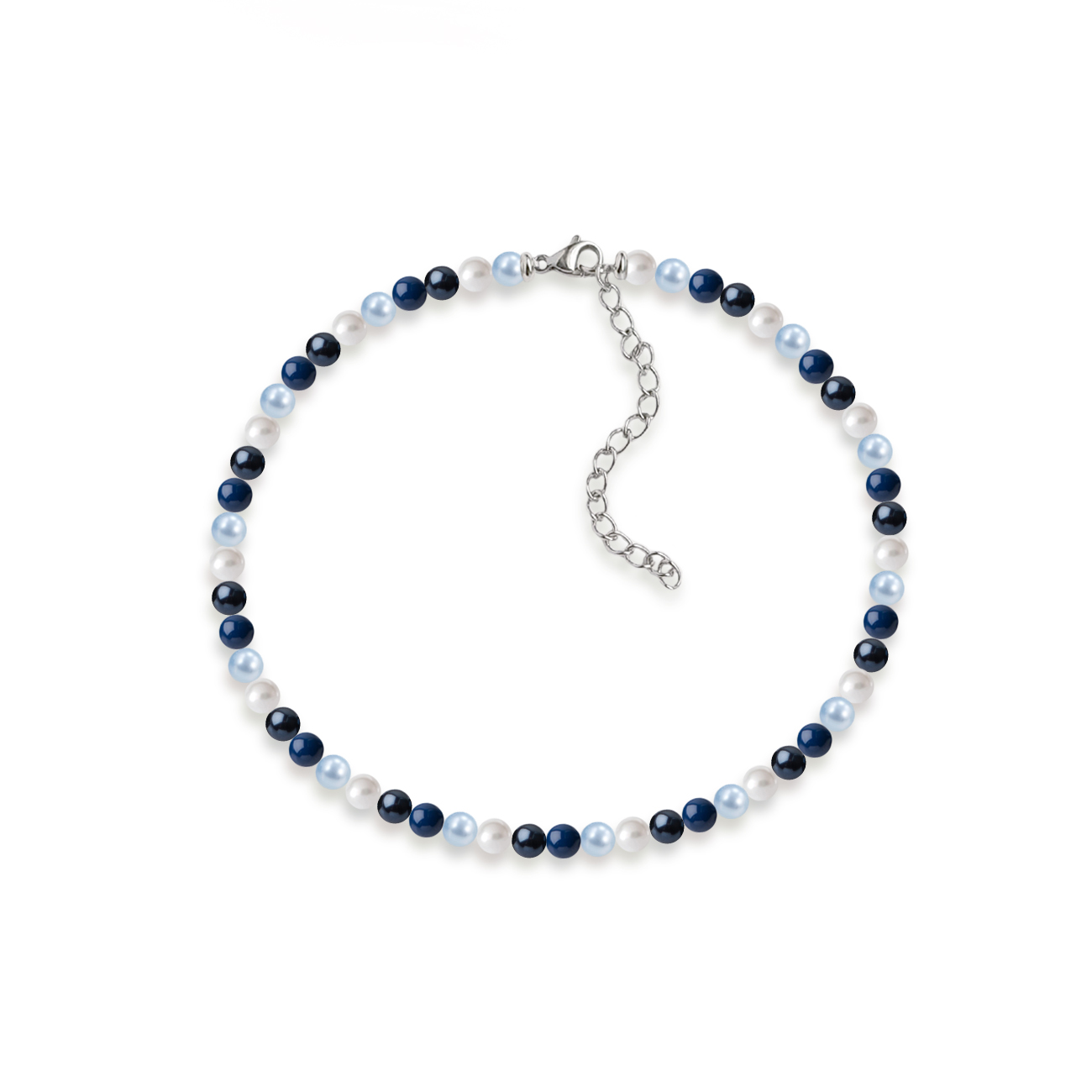 Tento náramek z kolekce Marine Blue Pearl je osázen voskovanými světle a tmavě modrými perlami o průměru 4mm v odstínech Crystal White, Light Blue, Dark Lapis a Night Blue z dílny rakouské společnosti Swarovski®. Lze jej nosit samostatně nebo náramky různě vrstvit. Voskové perle Swarovski jsou věrné imitace pravých perel.